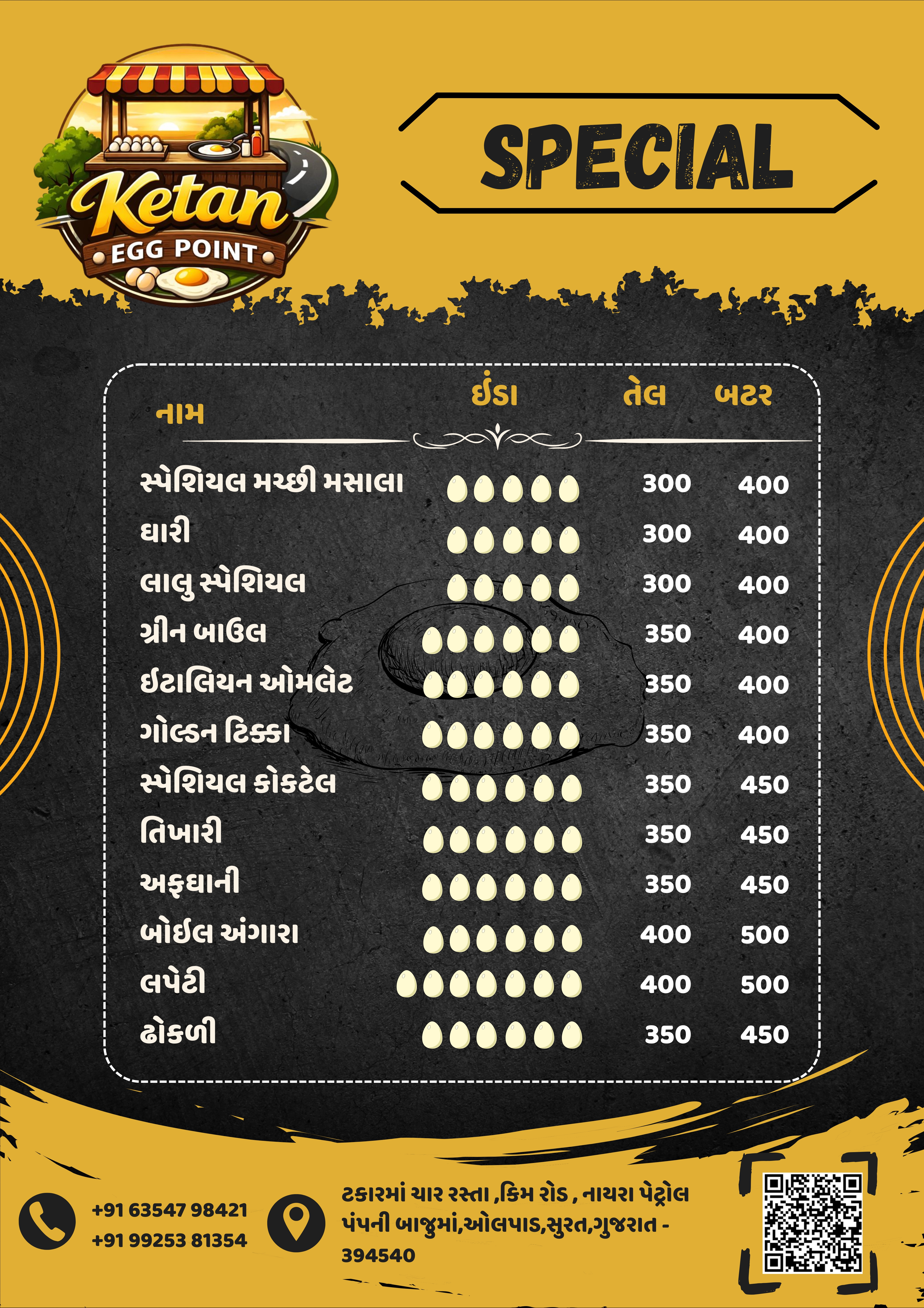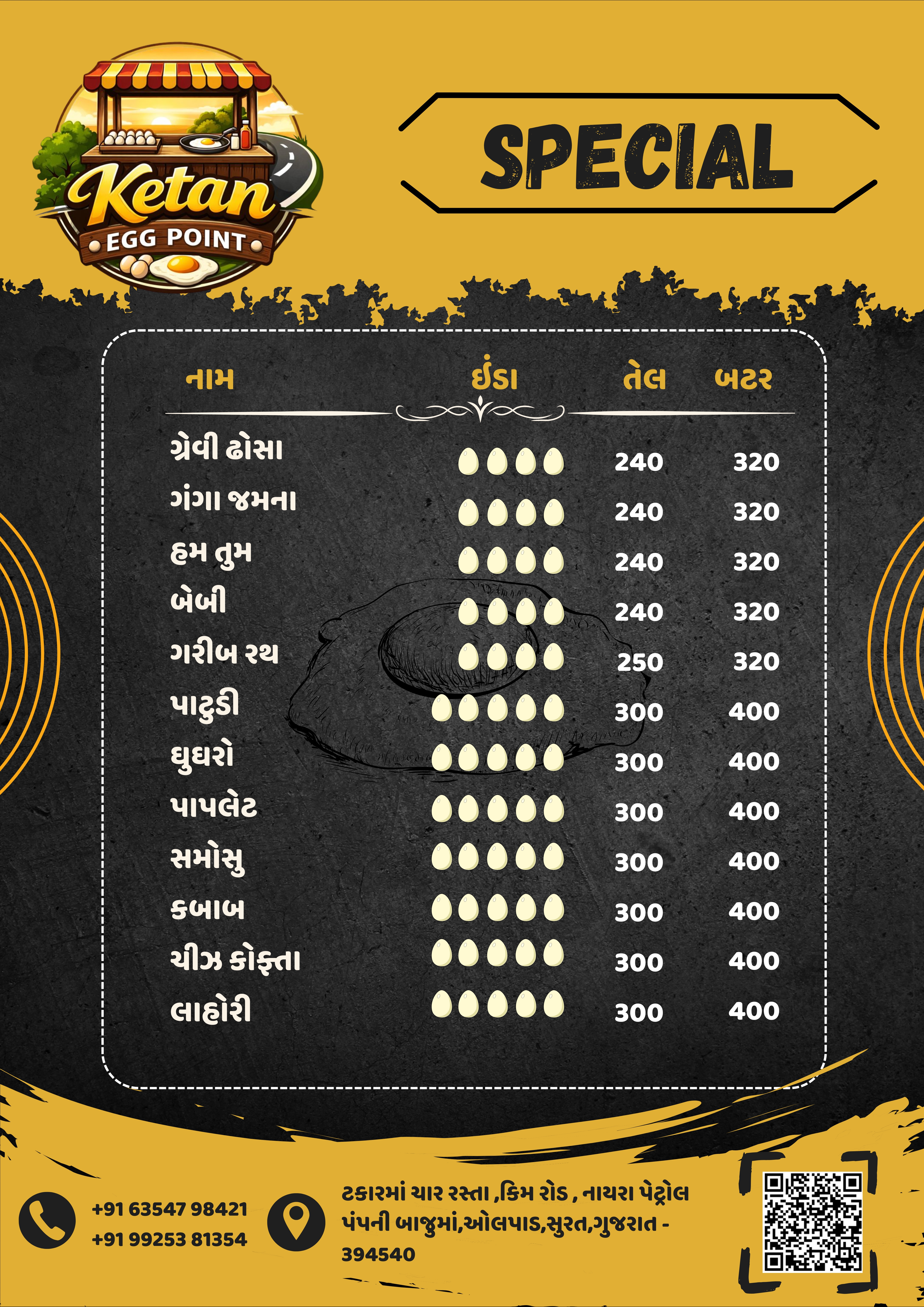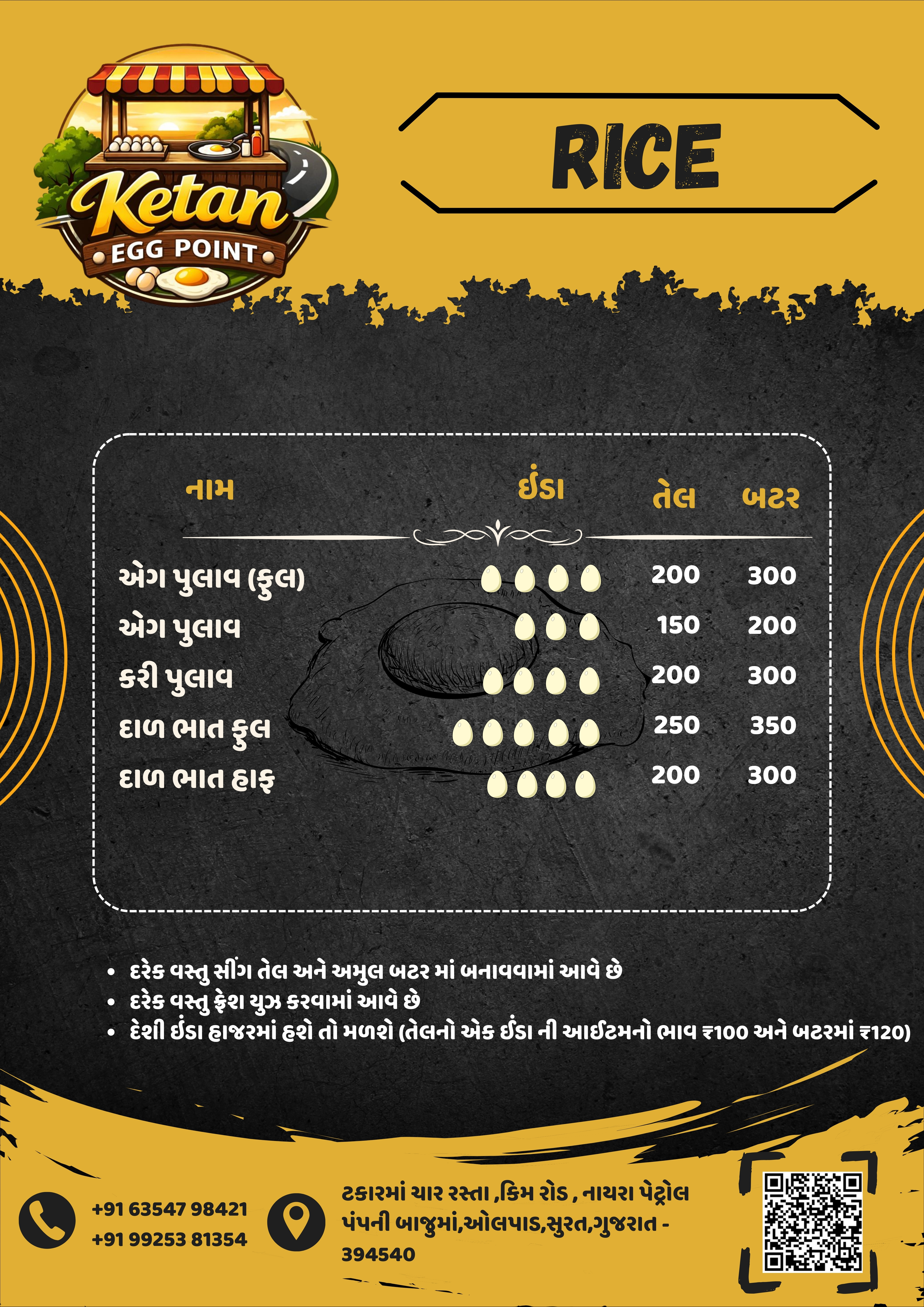 દેશી ઈંડા હાજર સ્ટોકમાં હશે તો મળશે । એક ઇંડાની આઈટમ તેલમાં ₹100 અને બટરમાં ₹120.