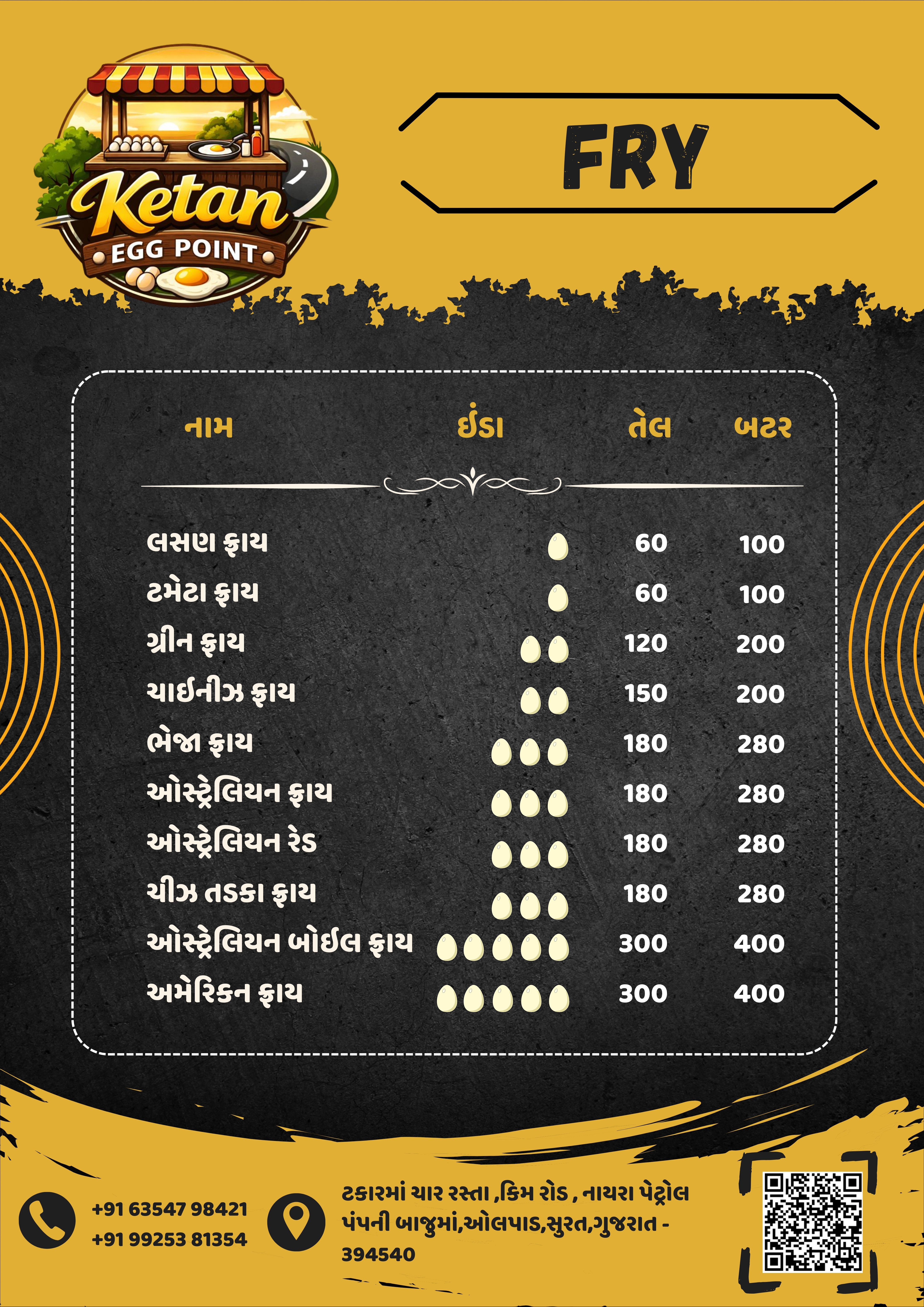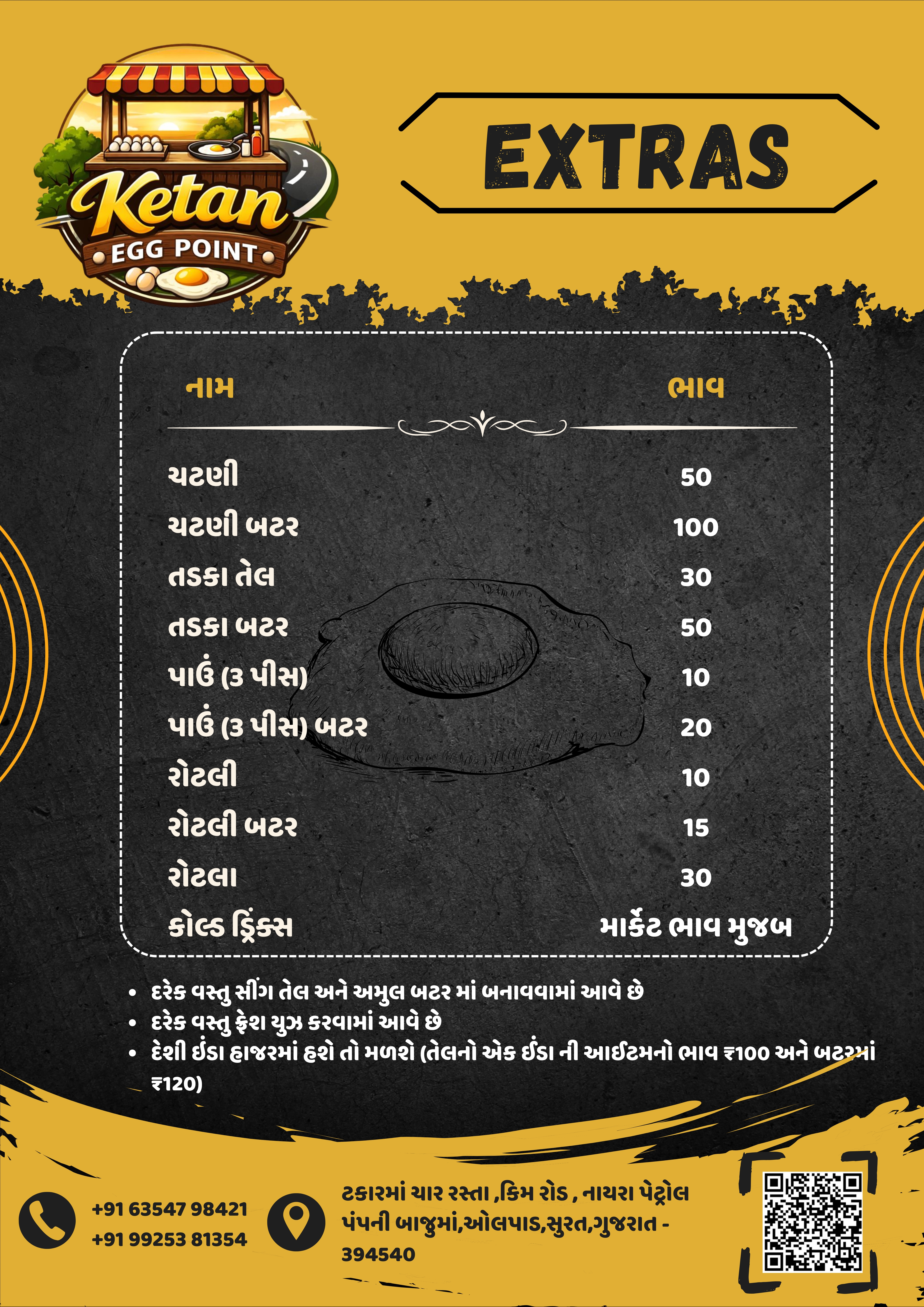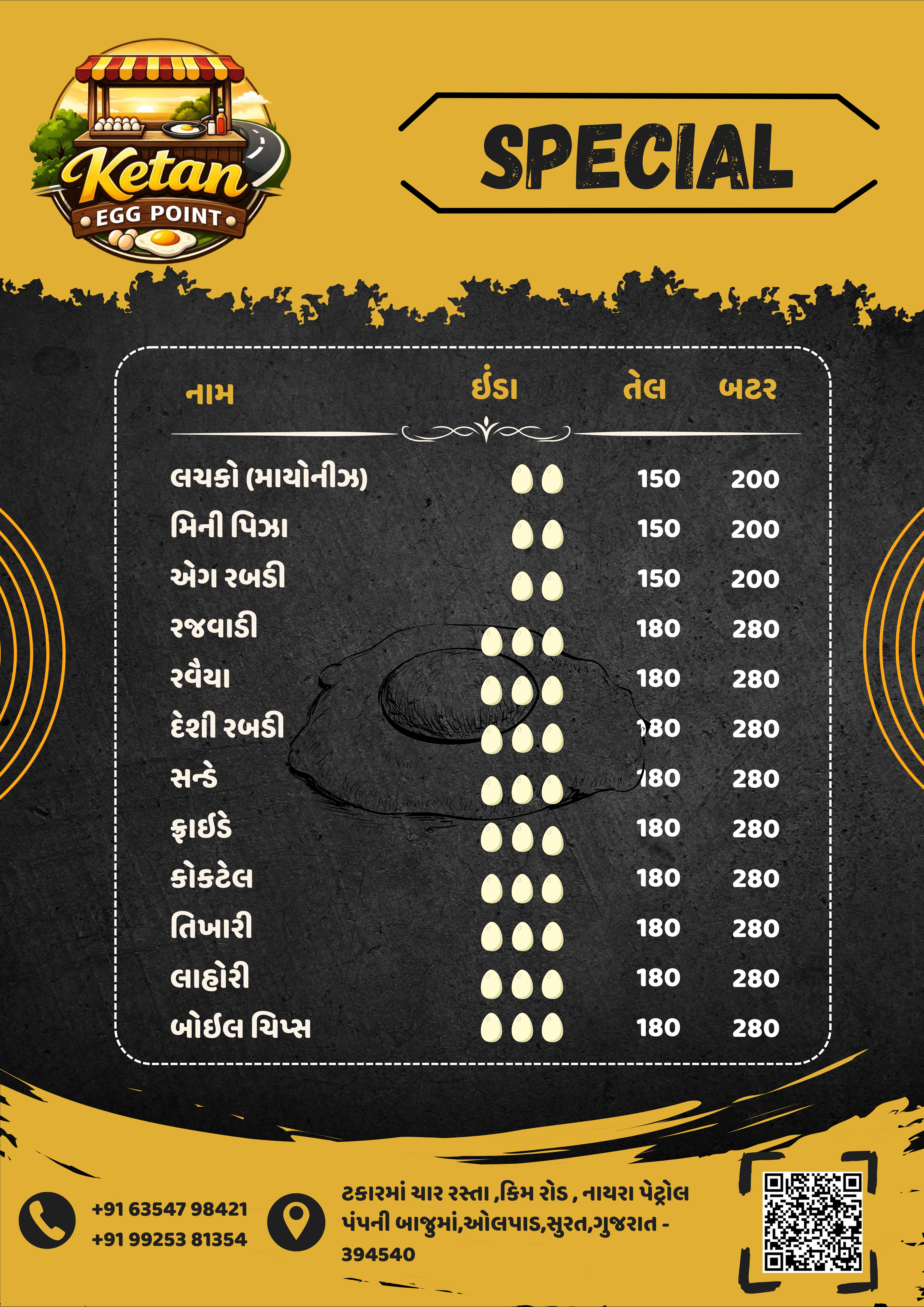 દેશી ઈંડા હાજર સ્ટોકમાં હશે તો મળશે । એક ઇંડાની આઈટમ તેલમાં ₹100 અને બટરમાં ₹120.